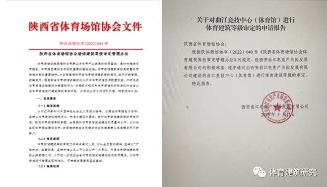 曲江竞技中心(体育馆),根据陕西省体育场馆协会陕体场馆协字(2022)040号文件精神,于2023年5月11日向陕西省体育场馆协会提交了申请审定体育建筑等级的报告。