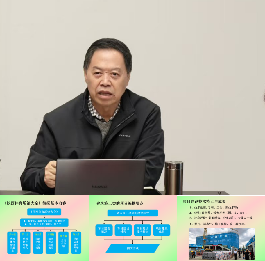 陕西体育建筑专家委专家、《陕西体育场馆大全》体育建筑施工类编撰主审郑建钢,针对建筑施工类编撰工作提出要求:一是提高认识,珍惜参编的历史机遇。各参编单位要立足体育建筑的发展理念与成果,彰显陕西体育建筑“鲁班奖”“长安杯”等体育建筑的获奖与风采。二是突出重点,充分展示技术创新。编撰要展现建筑施工单位在体育建筑中的技术优势与特色,精心提炼施工中的技术难点与创新成果。三是有序推进,严把编撰质量。各参编单位要专人负责严把编撰质量关,严格按照既定时间节点完成各阶段的编撰工作。